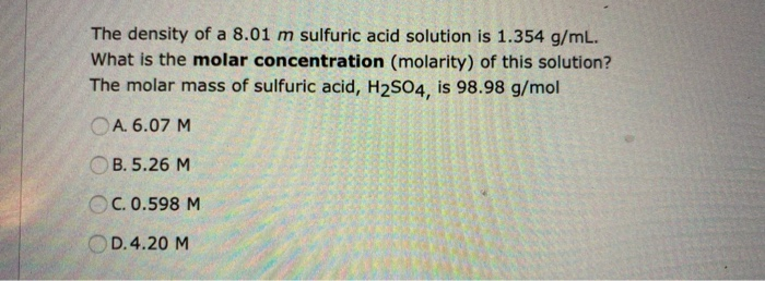 Solved The Density Of A 8 01 M Sulfuric Acid Solution Is Chegg Com - When calculating molecular weight of a chemical compound, it tells us how many grams are in one mole of that substance.